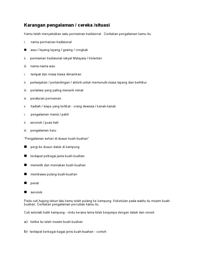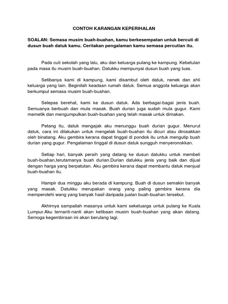 Pada musim buah-buahan yang lalu saya Ken dan Jeremy telah pergi ke dusun Pak Su. Koleksi Contoh Karangan SPM Bahasa Melayu Sijil Pelajaran Malaysia Berikut adalah contoh-contoh karangan mengikut tema yang selalu digunakan sebagai tajuk soalan karangan Bahasa Melayu. Bahasa Melayu Karangan Pengalaman Bercuti Di Kampung Contoh.